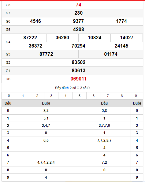- Giải đặc biệt: đầu 9 – đuôi 8