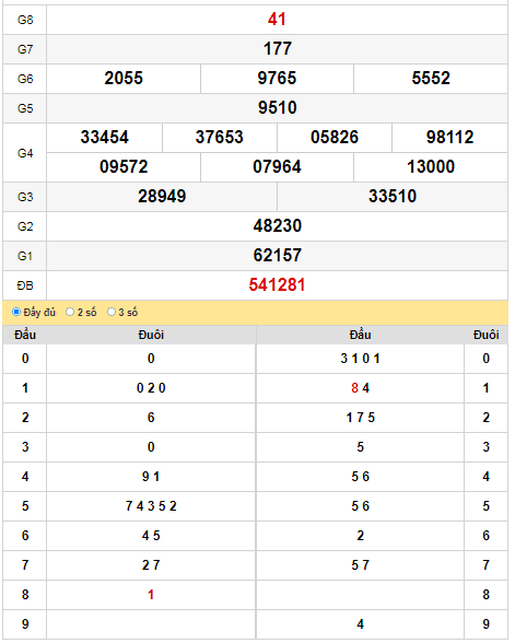 - Giải đặc biệt: đầu 9 – đuôi 5