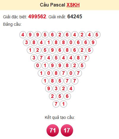 Thống kê cầu pascal xổ số KH tính theo công thức Pascale trong toán học dựa theo dữ liệu bảng kết quả ngày quay gần nhất giúp người chơi dễ dàng tính toán để chọn ra những bộ số may mắn của ngày hôm nay