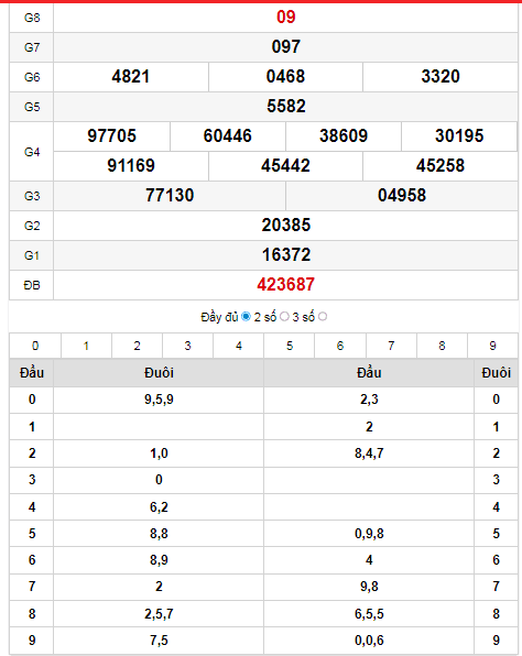 - Giải đặc biệt: đầu 9 – đuôi 3