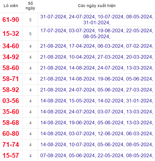 Bảng thống kê cặp lô xiên về nhiều nhất