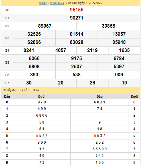 Dựa trên bảng kết quả xskt Miền Bắc hôm qua ngày 13/07/2022, chúng ta có được những thông tin sau: