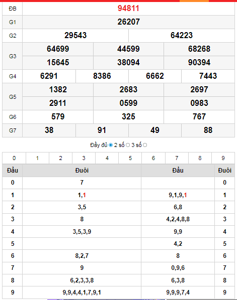 • Giải đặc biệt: đầu 3 – đuôi 8