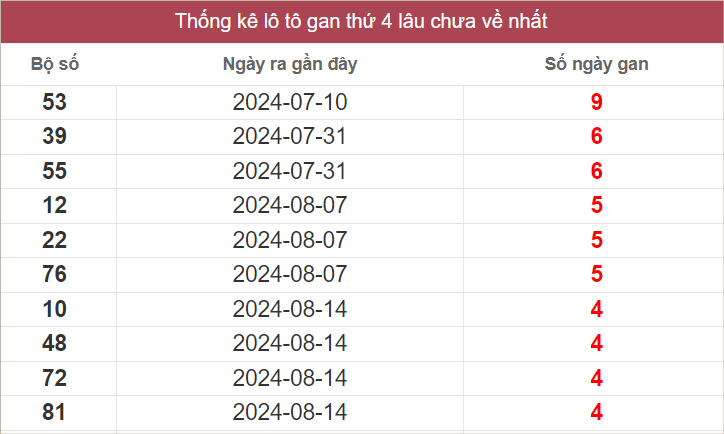Đuôi 0 gan 4 ngày – Đuôi 1 gan 8 ngày – Đuôi 2 gan 12 ngày – Đuôi 3 gan 10 ngày – Đuôi 4 gan 14 ngày – Đuôi 5 gan 16 ngày – Đuôi 6 gan 3 ngày – Đuôi 7 gan 1 ngày – Đuôi 8 gan 5 ngày – Đuôi 9 gan 0 ngày.