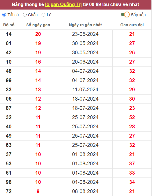 Dưới đây là tổng hợp số liệu thống kê kết quả xổ số Quảng Trị bao gồm thống kê lô gan, các bộ số lô tô xiên về nhiều, thống kê tần suất 2 số cuối giải đặc biệt của XSQT để giúp người chơi dễ dàng phân tích và chọn ra những bộ số may mắn nhất ngày hôm nay