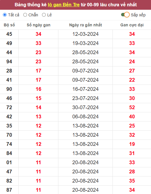 Dưới đây là tổng hợp số liệu thống kê kết quả xổ số Bến Tre bao gồm thống kê lô gan, các bộ số lô tô xiên về nhiều, thống kê tần suất 2 số cuối giải đặc biệt của XSBT để giúp người chơi dễ dàng phân tích và chọn ra những bộ số may mắn nhất ngày hôm nay