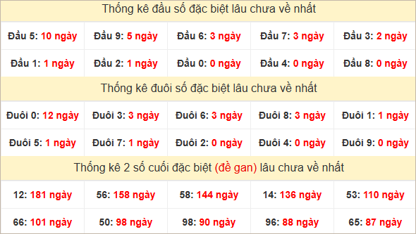 Đuôi 0 gan 12 ngày – Đuôi 1 gan 13 ngày – Đuôi 2 gan 33 ngày – Đuôi 3 gan 3 ngày – Đuôi 4 gan 0 ngày – Đuôi 5 gan 1 ngày – Đuôi 6 gan 5 ngày – Đuôi 7 gan 15 ngày – Đuôi 8 gan 4 ngày – Đuôi 9 gan 2 ngày.
