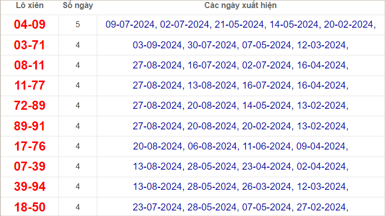 Đuôi 0 gan 28 ngày – Đuôi 1 gan 3 ngày – Đuôi 2 gan 11 ngày – Đuôi 3 gan 0 ngày – Đuôi 4 gan 2 ngày – Đuôi 5 gan 17 ngày – Đuôi 6 gan 4 ngày – Đuôi 7 gan 1 ngày – Đuôi 8 gan 20 ngày – Đuôi 9 gan 29 ngày.