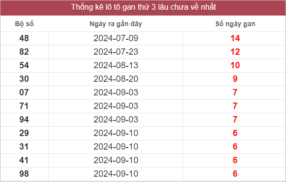 Đầu 0 gan 3 ngày – Đầu 1 gan 8 ngày – Đầu 2 gan 10 ngày – Đầu 3 gan 36 ngày – Đầu 4 gan 1 ngày – Đầu 5 gan 2 ngày – Đầu 6 gan 5 ngày – Đầu 7 gan 4 ngày – Đầu 8 gan 16 ngày – Đầu 9 gan 0 ngày.