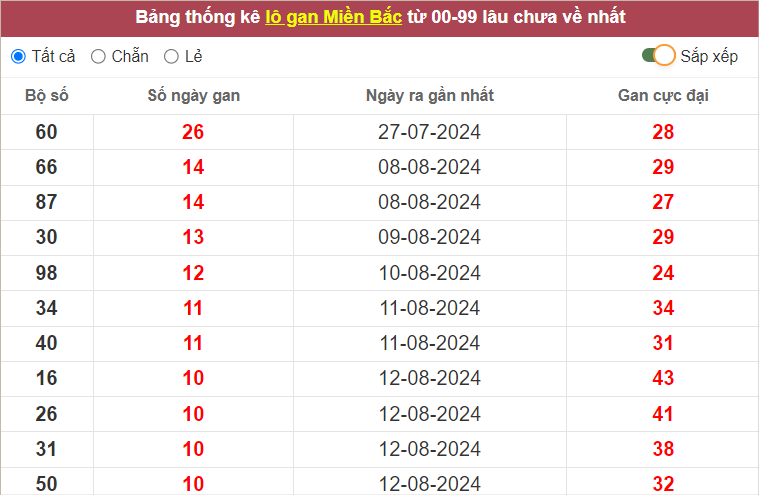 ⭐️ Thống kê lô gan miền Bắc lâu ra nhất: 60 – 66 – 87 – 30 – 98