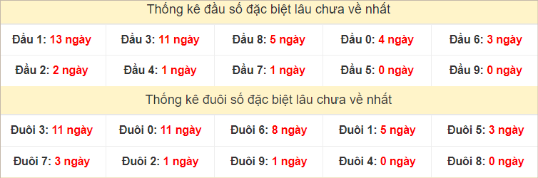 Đuôi 0 gan 9 ngày – Đuôi 1 gan 4 ngày – Đuôi 2 gan 8 ngày – Đuôi 3 gan 3 ngày – Đuôi 4 gan 1 ngày – Đuôi 5 gan 0 ngày – Đuôi 6 gan 2 ngày – Đuôi 7 gan 6 ngày – Đuôi 8 gan 5 ngày – Đuôi 9 gan 17 ngày.