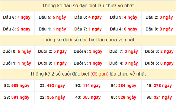 Đuôi 0 gan 17 ngày – Đuôi 1 gan 38 ngày – Đuôi 2 gan 5 ngày – Đuôi 3 gan 8 ngày – Đuôi 4 gan 2 ngày – Đuôi 5 gan 0 ngày – Đuôi 6 gan 10 ngày – Đuôi 7 gan 3 ngày – Đuôi 8 gan 1 ngày – Đuôi 9 gan 4 ngày.