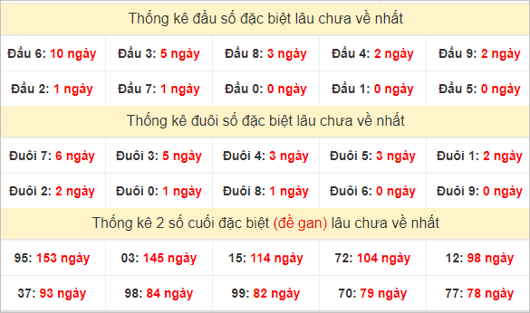 Đuôi 0 gan 1 ngày – Đuôi 1 gan 41 ngày – Đuôi 2 gan 8 ngày – Đuôi 3 gan 11 ngày – Đuôi 4 gan 5 ngày – Đuôi 5 gan 3 ngày – Đuôi 6 gan 0 ngày – Đuôi 7 gan 6 ngày – Đuôi 8 gan 4 ngày – Đuôi 9 gan 7 ngày.