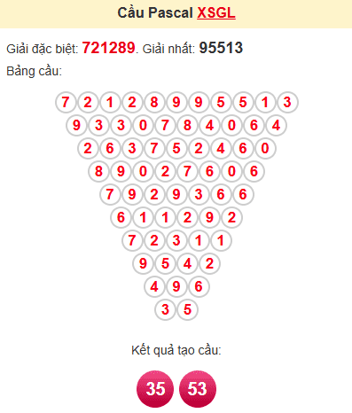 Thống kê cầu pascal xổ số GL tính theo công thức Pascale trong toán học dựa theo dữ liệu bảng kết quả ngày quay gần nhất giúp người chơi dễ dàng tính toán để chọn ra những bộ số may mắn của ngày hôm nay