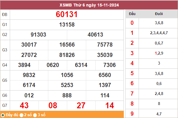 Bảng kết quả miền Bắc ngày 15/11/2024