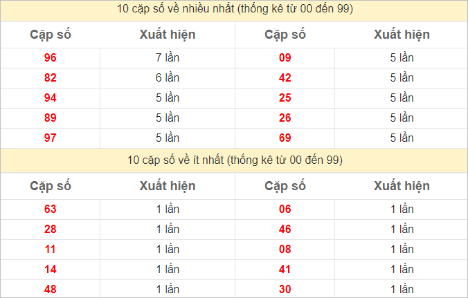 Thống kê 2 số cuối đặc biệt về nhiều nhất trong 30 tuần trở lại