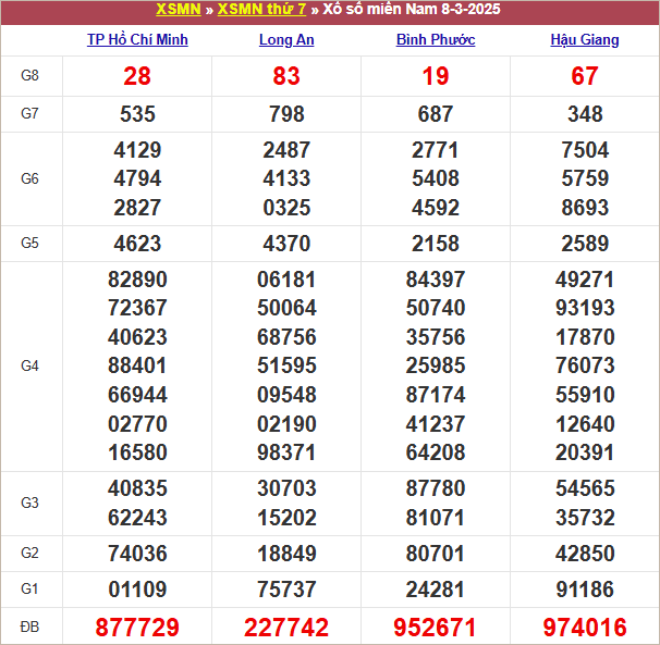 Tham khảo dự đoán kết quả xổ số miền Nam thứ 7 bao lô 4 đài (HCM, LA, BP, HG) miễn phí 100% được chốt dựa vào thuật toán xác suất thống kê kết hợp cùng phân tích kết quả XSMN T7 trực quan và toàn diện.