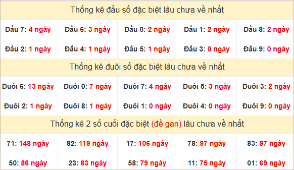 Đuôi 0 gan 13 ngày – Đuôi 1 gan 2 ngày – Đuôi 2 gan 16 ngày – Đuôi 3 gan 5 ngày – Đuôi 4 gan 14 ngày – Đuôi 5 gan 3 ngày – Đuôi 6 gan 22 ngày – Đuôi 7 gan 63 ngày – Đuôi 8 gan 1 ngày – Đuôi 9 gan 0 ngày.