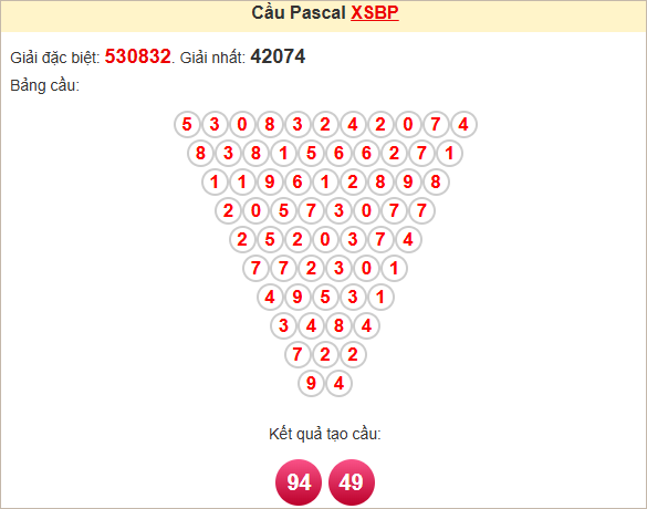 ⭐️ Kết quả từ soi cầu theo tam giác Pascale là cặp lô VIP: 94 – 49
