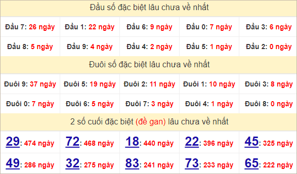 Đuôi 0 gan 7 ngày – Đuôi 1 gan 10 ngày – Đuôi 2 gan 11 ngày – Đuôi 3 gan 8 ngày – Đuôi 4 gan 1 ngày – Đuôi 5 gan 19 ngày – Đuôi 6 gan 5 ngày – Đuôi 7 gan 3 ngày – Đuôi 8 gan 0 ngày – Đuôi 9 gan 37 ngày.