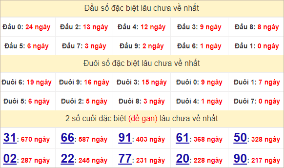 Đuôi 0 gan 6 ngày – Đuôi 1 gan 0 ngày – Đuôi 2 gan 4 ngày – Đuôi 3 gan 1 ngày – Đuôi 4 gan 3 ngày – Đuôi 5 gan 33 ngày – Đuôi 6 gan 10 ngày – Đuôi 7 gan 2 ngày – Đuôi 8 gan 28 ngày – Đuôi 9 gan 8 ngày.