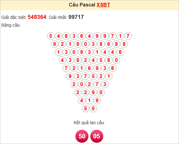 Kết quả nhận được từ soi cầu Pascale là cặp số may mắn:50 – 05
