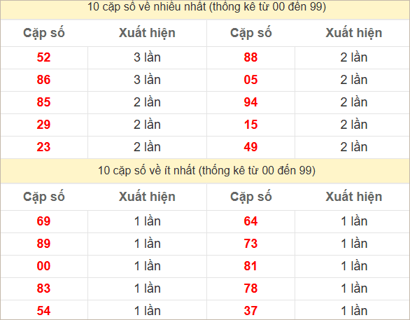 ⭐️ Thống kê 10 cặp số đặc biệt miền Trung thứ 4 về nhiều nhất – ít nhất trong 10 tuần gần đây:
