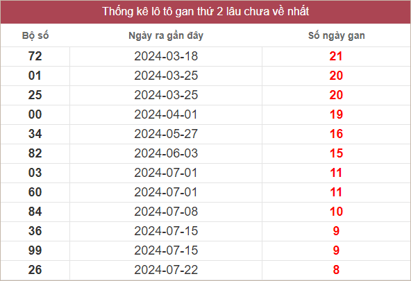 Đuôi 0 gan 13 ngày – Đuôi 1 gan 7 ngày – Đuôi 2 gan 11 ngày – Đuôi 3 gan 2 ngày – Đuôi 4 gan 6 ngày – Đuôi 5 gan 0 ngày – Đuôi 6 gan 36 ngày – Đuôi 7 gan 18 ngày – Đuôi 8 gan 1 ngày – Đuôi 9 gan 3 ngày.