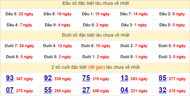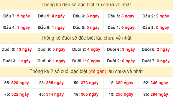 Đuôi 0 gan 22 ngày – Đuôi 1 gan 0 ngày – Đuôi 2 gan 2 ngày – Đuôi 3 gan 1 ngày – Đuôi 4 gan 16 ngày – Đuôi 5 gan 3 ngày – Đuôi 6 gan 29 ngày – Đuôi 7 gan 9 ngày – Đuôi 8 gan 4 ngày – Đuôi 9 gan 5 ngày.