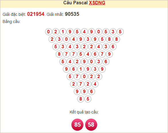 ⭐️ Kết quả nhận được từ soi cầu Pascale là cặp song thủ lô: 85 – 58