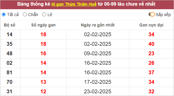 Thống kê lô gan Thừa Thiên Huế lâu chưa ra