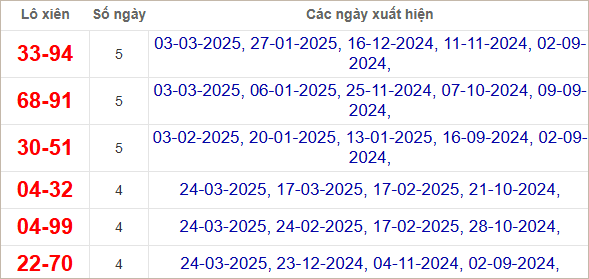2. Bảng thống kê tần suất cặp lô xiên 2 hay về